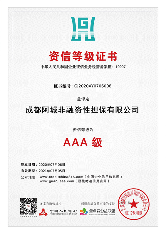 2020年7月公司荣获荣获中国人民银行备案评级机构的AAA级资信等级评级,这是对公司一直以来坚守的诚信经营,品德赢人心的企业理念的一大肯定,也是让公司走的更长更远的一大鼓励。